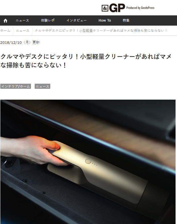 皆様、こんにちは。ご支援とご興味、ありがとうございます。 喜ばしいことに、本プロジェクトの”クルマやデスクにピッタリ!小型軽量クリーナーがあればマメな掃除も苦にならない!”をグッズプレスにて取り上げて頂きました!https://www.goodspress.jp/news/199285/2/