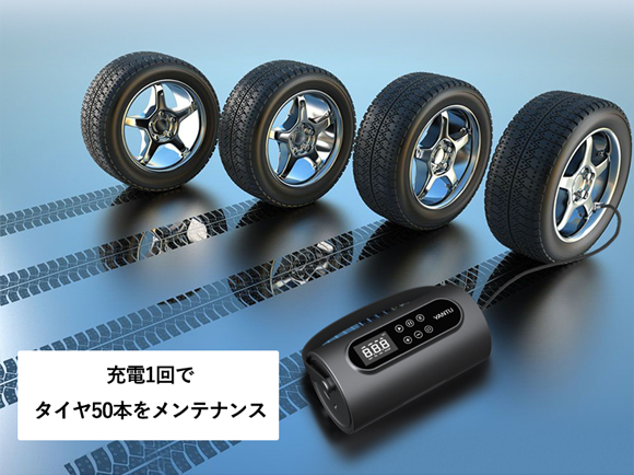 2.3→2.5barのような普段のよくある空気圧メンテナンスの場合、1回の充電でタイヤ50本を充填することが可能!面倒なコマメな充電は不要です。