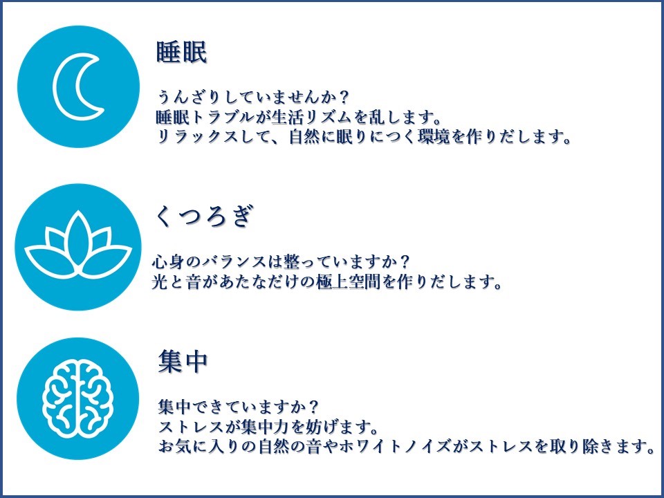 普段から寝つきが悪い人、環境が変わると寝付けない人、仕事柄いつも同じ時間サイクルで眠れない人、よく泣く赤ちゃんなど、眠りに問題を抱えている人には効果的にお使いいただけます。