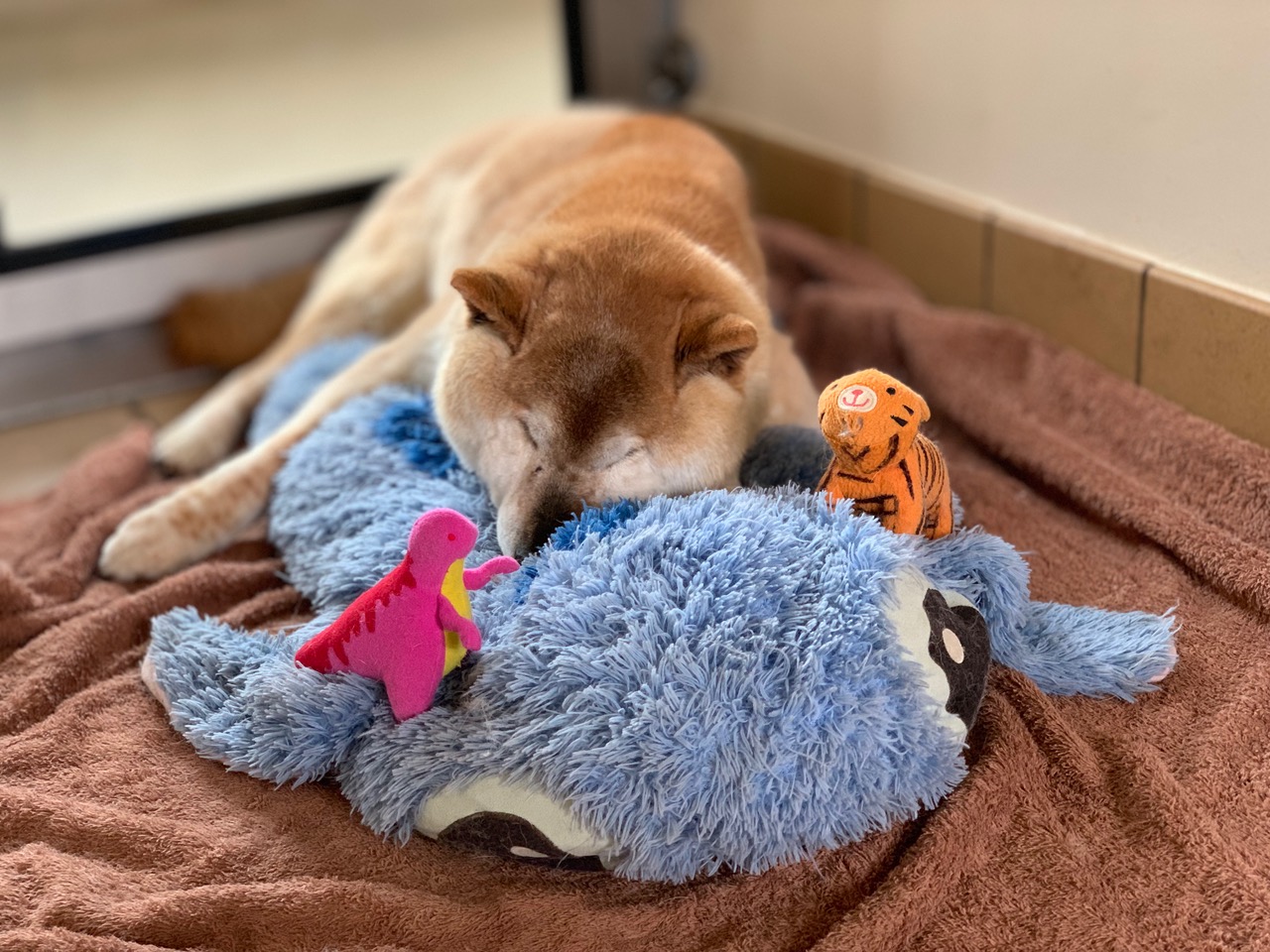 篠山では、毎日大好きなドッグランで走り回り、犬舎でもベッドで寝ている姿をよく見るようになり、一時は14kg台まで落ちてしまった体重も今では20kgになり、筋肉ムキムキの細マッチョになっています。