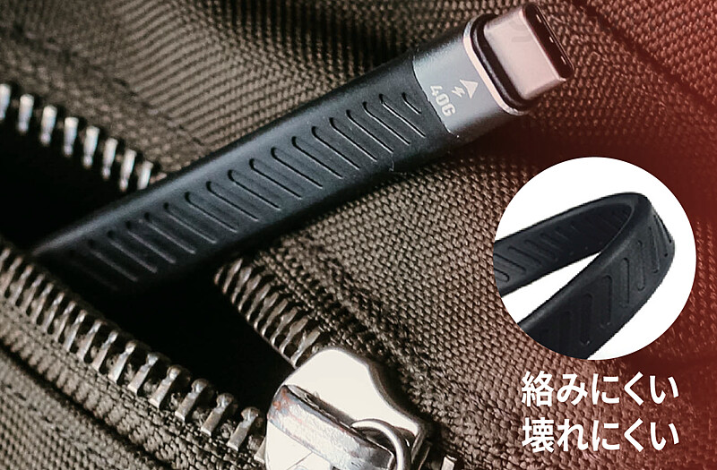 特徴的な平らな形のケーブルは、内側に特殊加工を施したアルミ素材を使用しており、絡みにくく、かつ壊れにくい作りに。