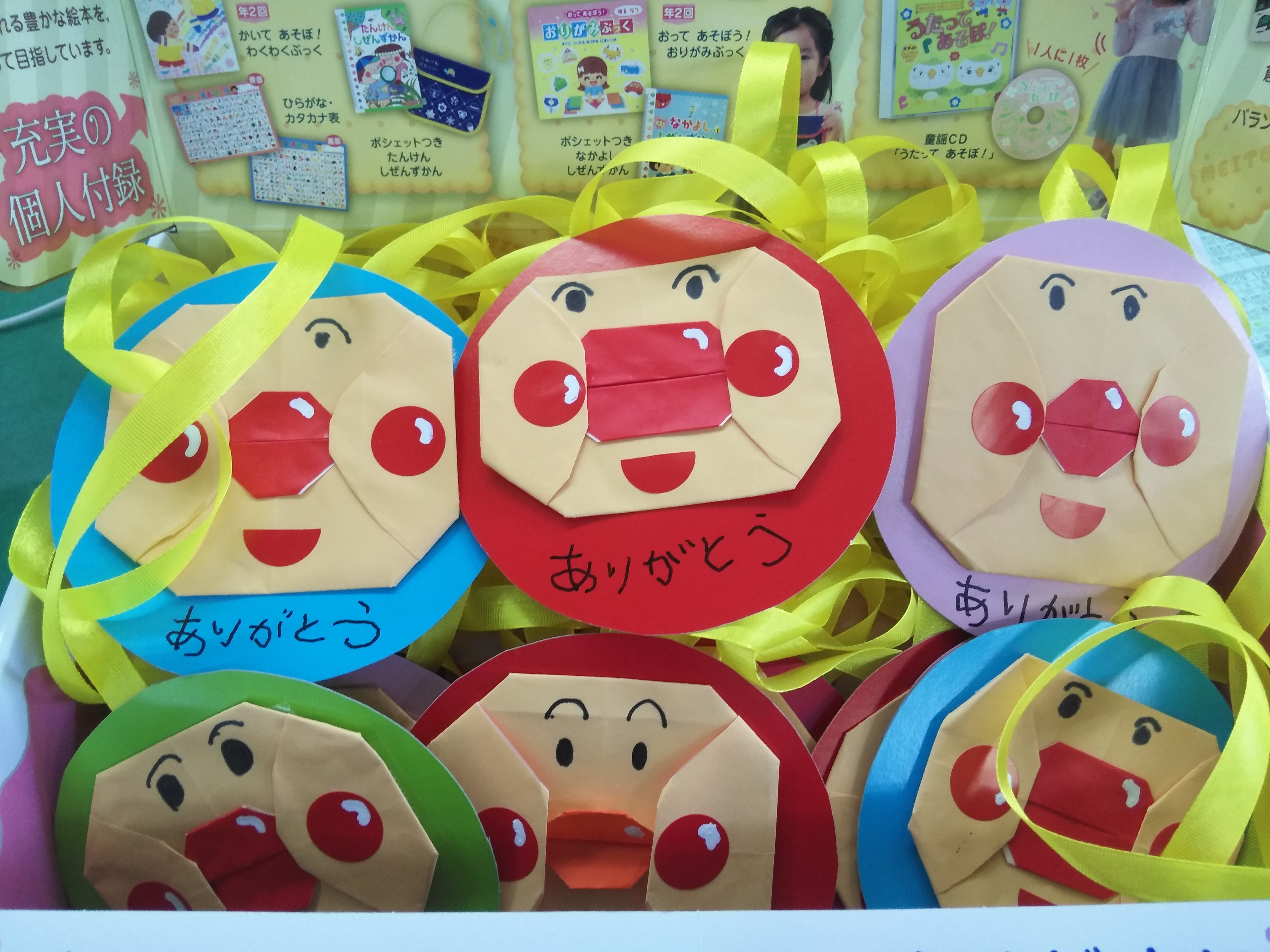 返礼品につきまして、市内保育園から園児作成の工作「金メダル」をお預かりしました。市内保育園の年長の園児の皆さんが作りました。