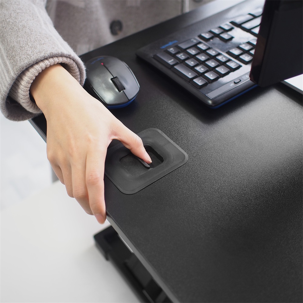 指一本で、高さを5.5〜40㎝の間で自由に調整して頂くことができます。また、段階調整ではないので身長や使用しているデスクの高さに関わらず好きな高さに調整して利用することができます。