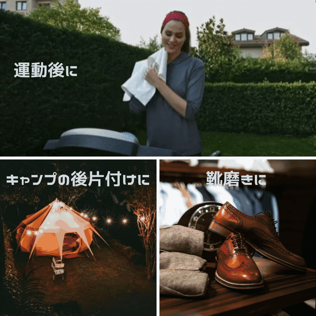 キャンプにアステリオンハイテクワイパーをもっていけば、その場でキャンプ道具の汚れが落ちるので、後片付けが楽になります。